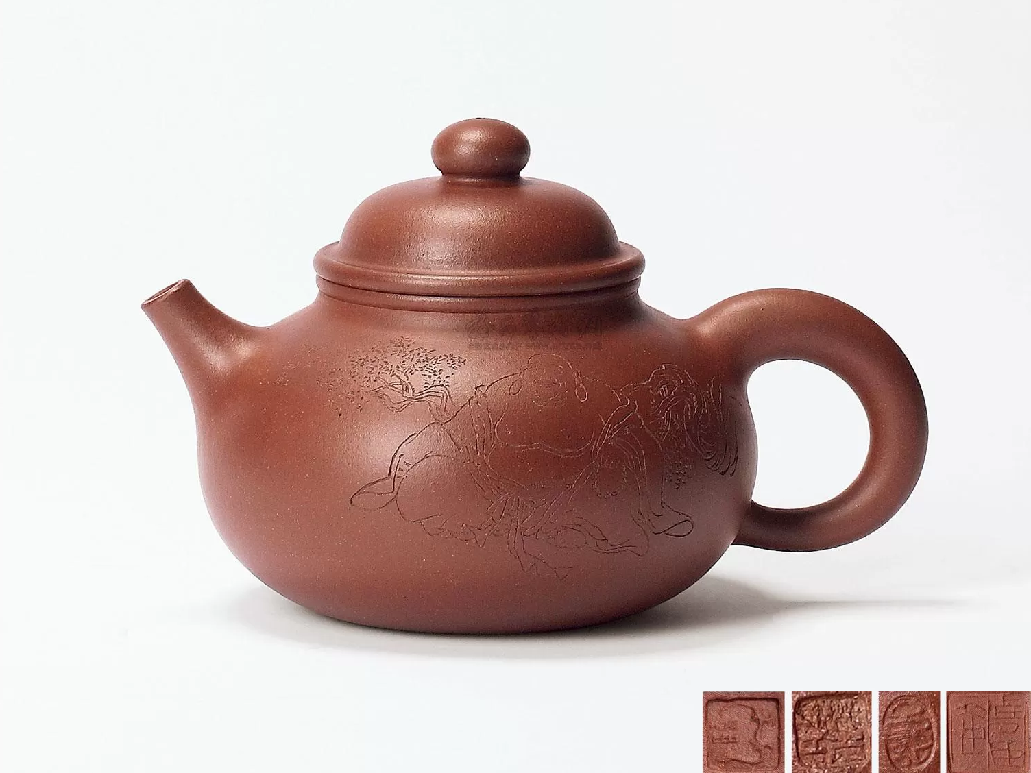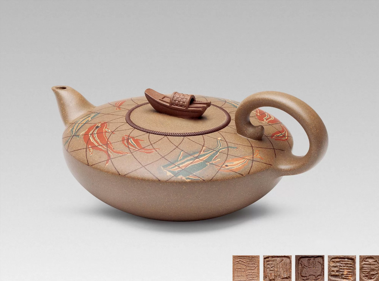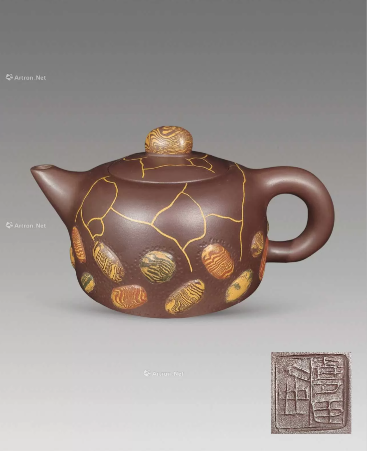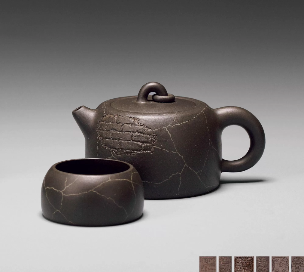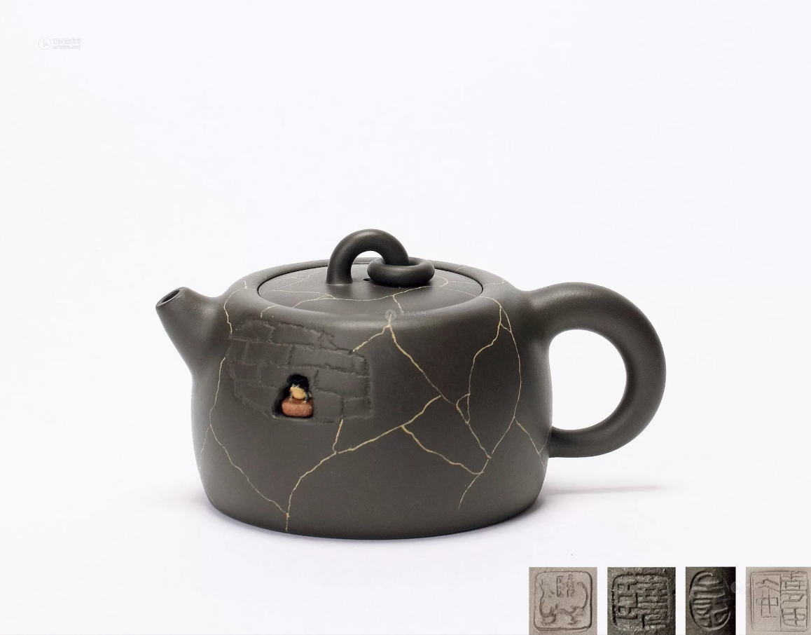 CN: 绞泥技法的巅峰之作。壶身纹理层峦叠嶂,意境深远,被北京故宫博物院收藏。